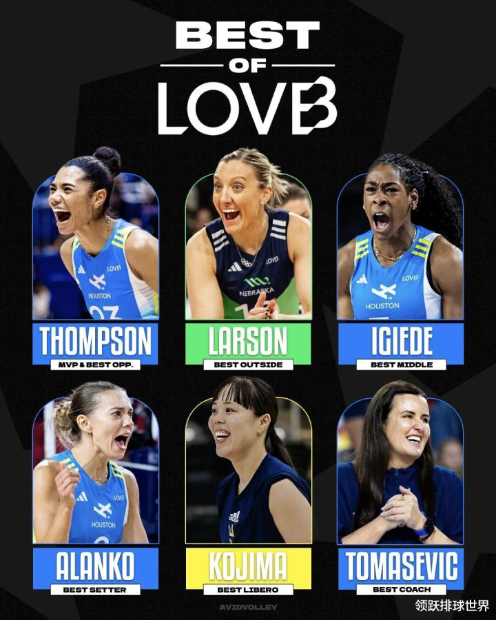 本赛季最受关注的赛季最有价值球员由休斯顿队接应乔丹·汤普森获得,这位美国国手打出了LOVB历史上最具统治力的赛季表现。她全赛季砍下455分,场均6.15分,同时贡献423次扣球得分,场均5.72次,两项数据均刷新联赛纪录,并且领先第二名超过120分,优势极其明显。