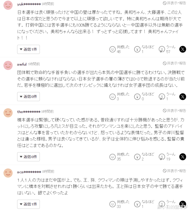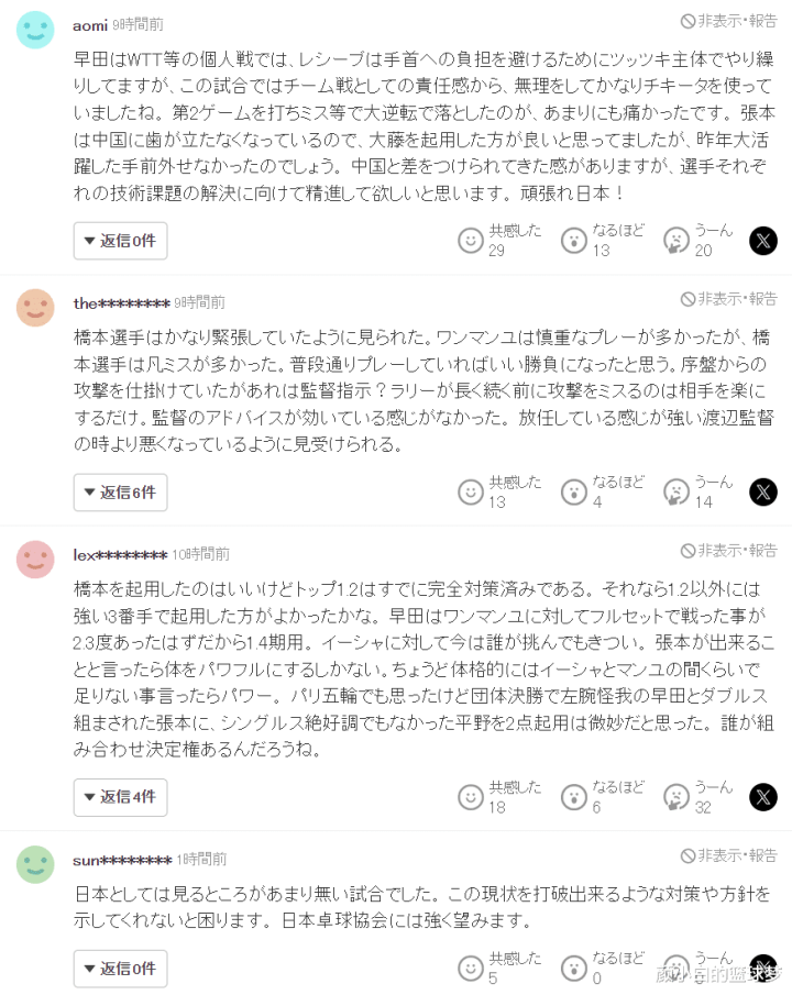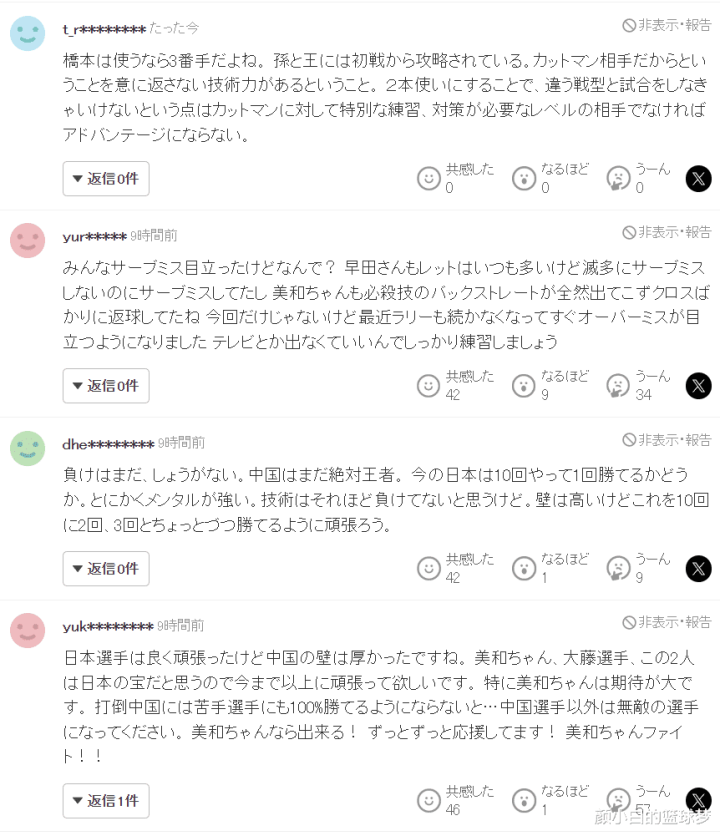 日本球迷们评价了这场女团决赛:1.桥本要打应该用三单,她根本打不过孙颖莎、王曼昱这样的顶级选手,削球手在面对有超强进攻能力的选手时根本没有任何优势可言;