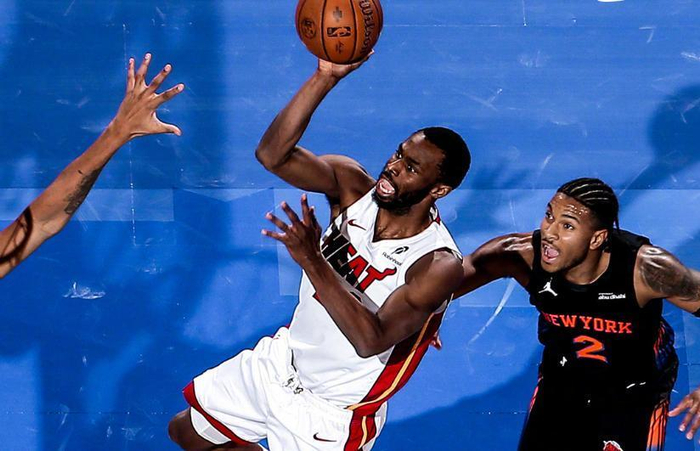 本场比赛双方都有核心球员缺战,热火少了希罗和阿德巴约,而尼克斯后场大将布伦森则躺在伤病大名单中,这也让两大状元郎维金斯和唐斯的对决成为了此战的最大看点,二人此役都出任先发大前锋,一上来就直接对位,但维金斯无论是竞技状态,还是积极性都不如对手,前两节只有7中2的发挥,反观唐斯半场就狂砍31分,帮助尼克斯带着10分的领先优势回到了中场更衣室。