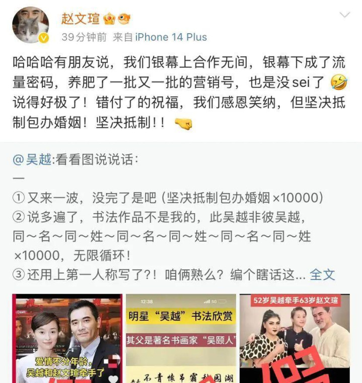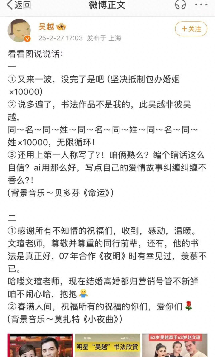当事人这回没选择忍气吞声,而是直接下场“拆台”。吴越先把那些假新闻截图一股脑晒出来,配上“坚决抵制包办婚姻”之类的话,等于明着跟造谣的对着干,还顺带科普一句:自己连那啥“书法情书”都不是她写的,别再瞎编了。