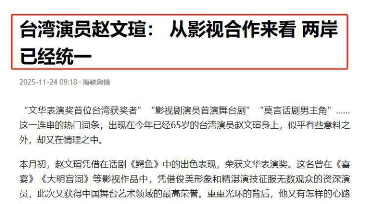 赵文瑄这次“圈粉”,很多人说就看在他那句关于两岸的话上:大意就是,两边中间隔着一条海峡,但这几年拍戏合作一直都挺紧密的,从文艺这块看,其实早就像一家人一起干活了。