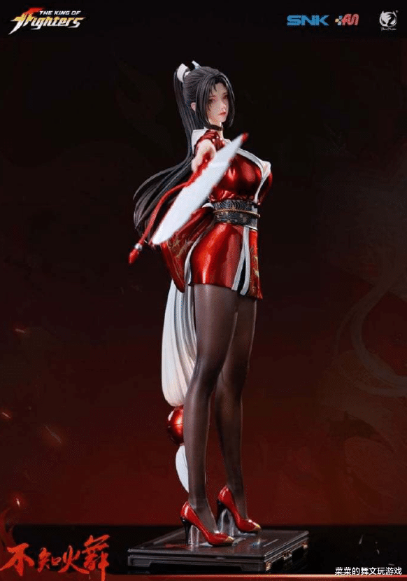 官方信息显示,这款不知火舞周年手办身着角色标志性的红白色和服短裙,裙摆和腰侧都点缀有火焰花纹。手办发型是经典的高马尾,下身穿着则是黑色丝袜和红金两色搭配的高跟鞋。