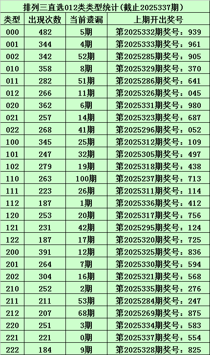上期回顾:体彩排列三第2025337期开出奖号:554,其012路比为0:1:2,奖号012路类型为:221。
