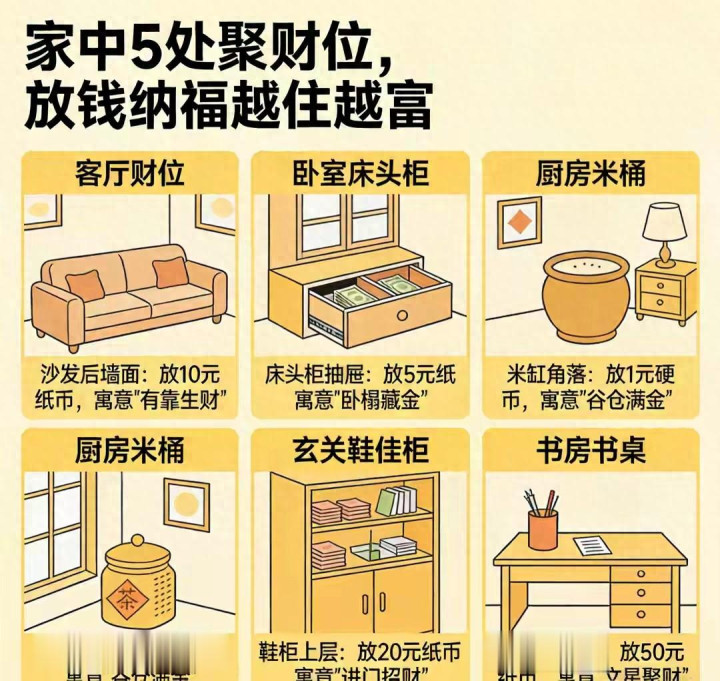 总有人感慨,赚钱不难守财难,辛苦挣来的钱,不知不觉就花出去,手里始终留不住积蓄,家里也总少了几分富足安稳的气息。其实从传统居家民俗来说,留不住财并非偶然,想要聚财纳福,不用大费周章,只需在家里这5个关键位置,悄悄放上一些钱,就能借助吉祥寓意,守住财运、聚拢福气,让家宅越来越兴旺,日子越过越富有。