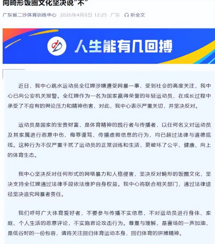 广东二沙体育训练中心第一时间报警,国家体育总局介入核查,央媒连发锐评痛批畸形饭圈文化。