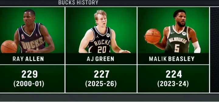 说到本赛季的三分表现,就不得不提格林的成长速度,真的太惊人了!本赛季至今,格林已经命中227记三分,成功超越了迈克尔-比斯利在2023-24赛季创下的224记三分纪录,稳稳高居雄鹿队史单赛季三分命中数第二位,一步一个脚印,书写着属于自己的传奇。