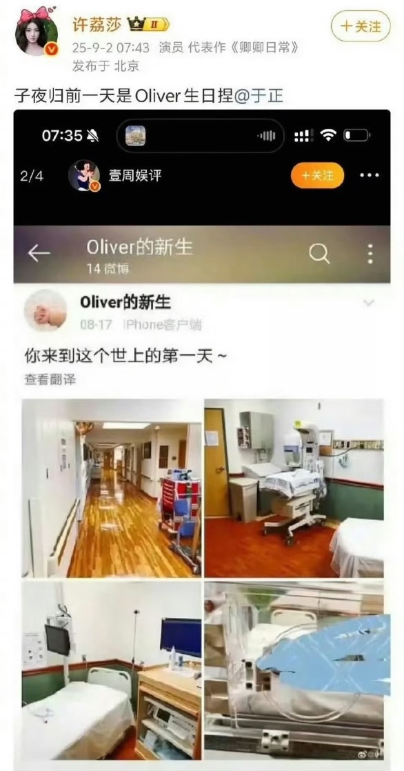 9月2日,许荔莎发了一条动态,虽然没有直接提于正的名字,但却说,于正新上映的影片《子夜归》的前一天,是孩子Olive的生日。