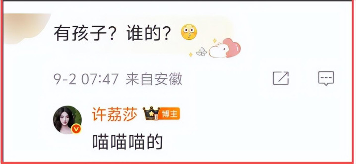 当网友在评论区求证孩子是谁的时,许荔莎还特意回复道:喵喵喵的。