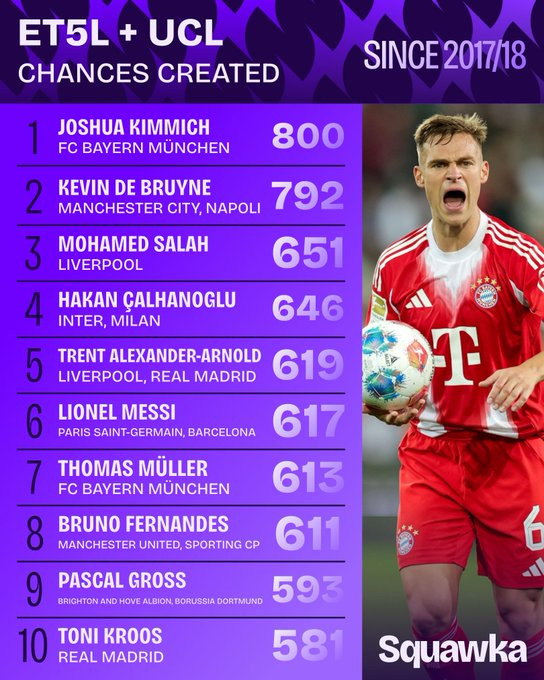 虎扑09月06日讯据Squakwa统计,自17/18赛季以来五大联赛+欧冠创造机会榜,其中基米希以800次居首。