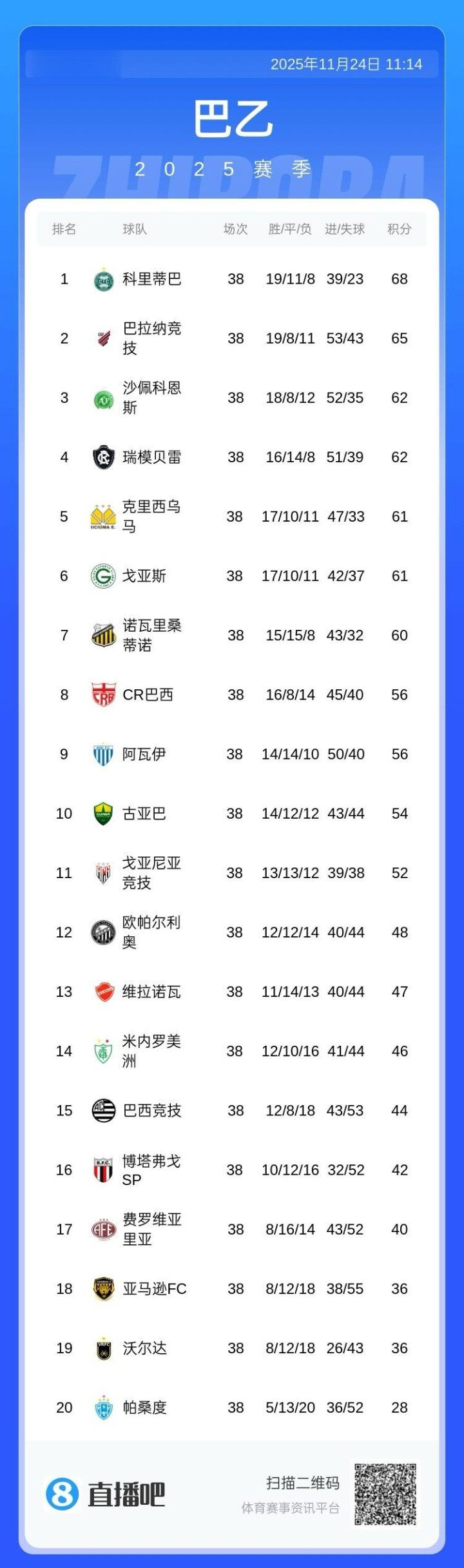直播吧11月24日讯2025赛季巴乙联赛结束全部争夺,科里蒂巴等4队升入巴甲。
