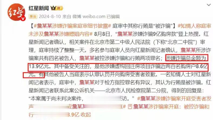 当时网友还调侃"女神终于嫁入豪门",可谁曾想,这位"豪门"早有前科——2005年,23岁的詹浩礼就因金融诈骗入狱6年!更讽刺的是,2022年他再次因涉嫌房地产诈骗被抓,涉案金额高达13.9亿元,其中8.6亿是靠虚构回迁房项目骗来的,受害者近200人,连麦吉丽老板都被坑了上亿。