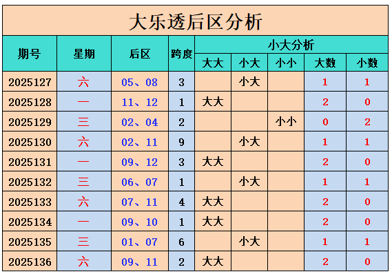 最近10期后区大小比为14:6,最近10期后区大大组合开出5期,小大组合开出4期,小小组合开出1期。上期开出大大组合,本期看好小大组合出现。
