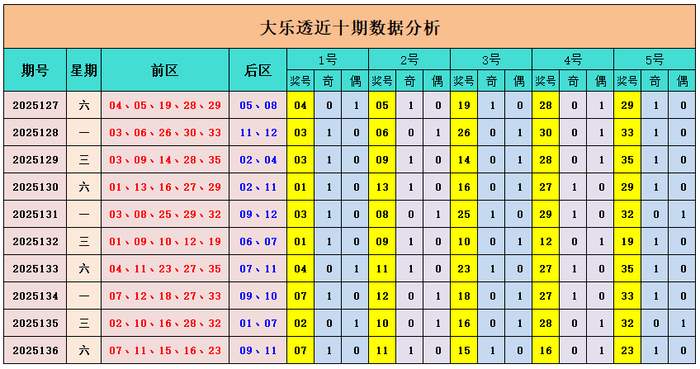前区一号球:上期开出奖号07,与前期相比上升5个点位,大于近10期1号球平均值3.5,本期预计点位下降,近10期开出的一号球中有7个奖号为奇数,上期一号球开出奇数,本期一号球推荐奖号04