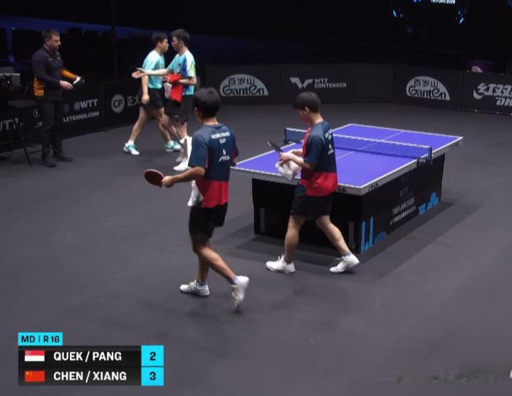 刚刚陈垣宇/向鹏苦战五局,3-2险胜新加坡的冯耀恩/郭勇(8-11,11-3,11-9,7-11,13-11),决胜局只胜了2分。