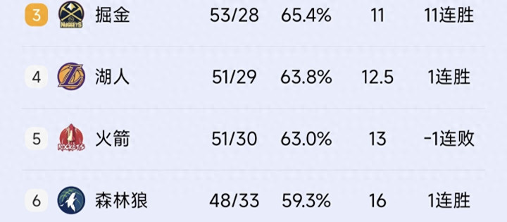 北京时间4月11日上午,NBA第81场比赛进行。伴随着火箭队主场132:136不敌森林狼和湖人主场击败太阳,火箭队正式锁定西部第五,再也没有争夺西部第四的机会。这场比赛过后,火箭队落后掘金2个胜场,已经无法追上对方。同时,火箭队落后湖人1个胜场,但是由于他们和湖人的交手记录处于下风,即便最后一轮他们赢球湖人输球,双方的战绩也只是持平,火箭队无法超越湖人。因此,火箭队最终锁定西部第五。