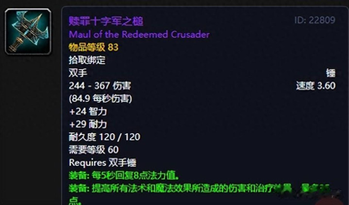 不过赎罪十字军之槌不加力量和敏捷,而是加 24智力、29耐力,以及每5秒回复8点法力值,除此之外,还加35点法伤和治疗效果。
