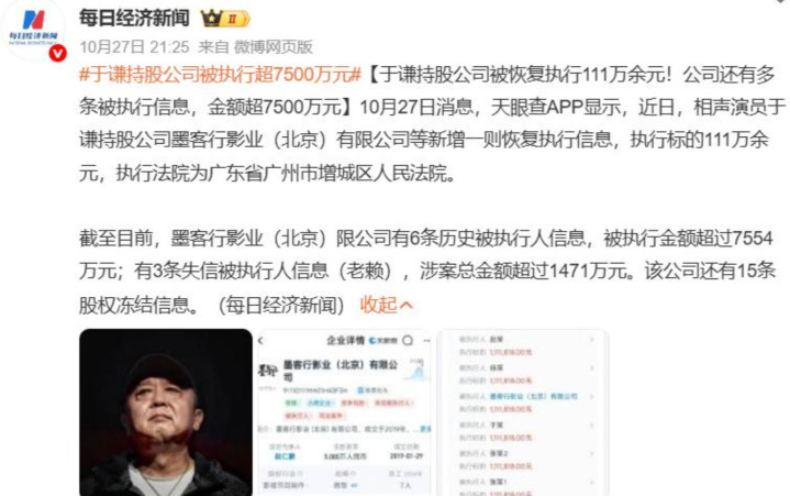 今年10月27日,广州市相关法院恢复执行一起涉及于谦的债务案件。