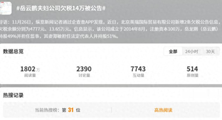 既不是因为绯闻,也不是作品惹了争议,而是他和妻子的公司被税务局点名——欠税14万。